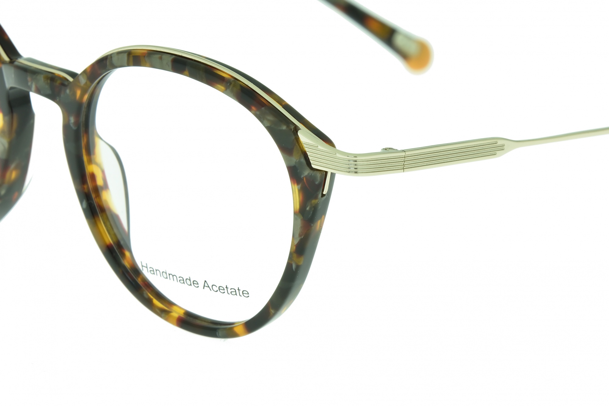 Oprawa damska wykonana z bardzo dobrej jakości tworzywa. Front oprawy wzorzysty w połyskujących odcieniach brązu i szarości. Zauszniki w połyskującym złotym kolorze ze wzorzystymi nasadkami zakończonymi pomarańczowym zdobieniem.