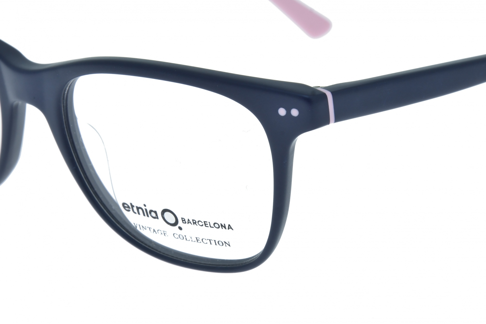 Oprawa damska wykonana z tworzywa. Front oprawy w matowym ciemnoniebieskim kolorze. Zauszniki matowe w kolorze ciemnoniebieskim z jasnoróżową końcówką.
