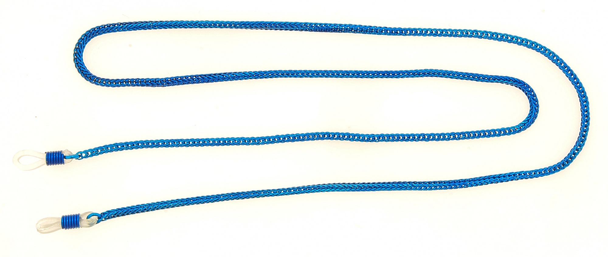 Łańcuszek o wyjątkowo intensywnym, połyskującym, niebieskim kolorze, wykonano z bardzo lekkiego stopu metalu, zaplecionego w misterną jodełkę. Dzięki temu splotowi bardzo ładnie się układa. Mocowanie na okulary wykonano z przeźroczystego silikonu.