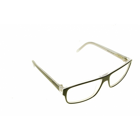 Okulary wykonano z połyskującego trójwarstwowego tworzywa, od zewnątrz czarnego, w środku białego, a od wewnątrz oprawy transparentnego, przez który przebija biała warstwa. Na zausznikach dodano metalową przestrzenną wstawkę z logo producenta. Zdecydowana oprawa o nowoczesnej stylistyce.